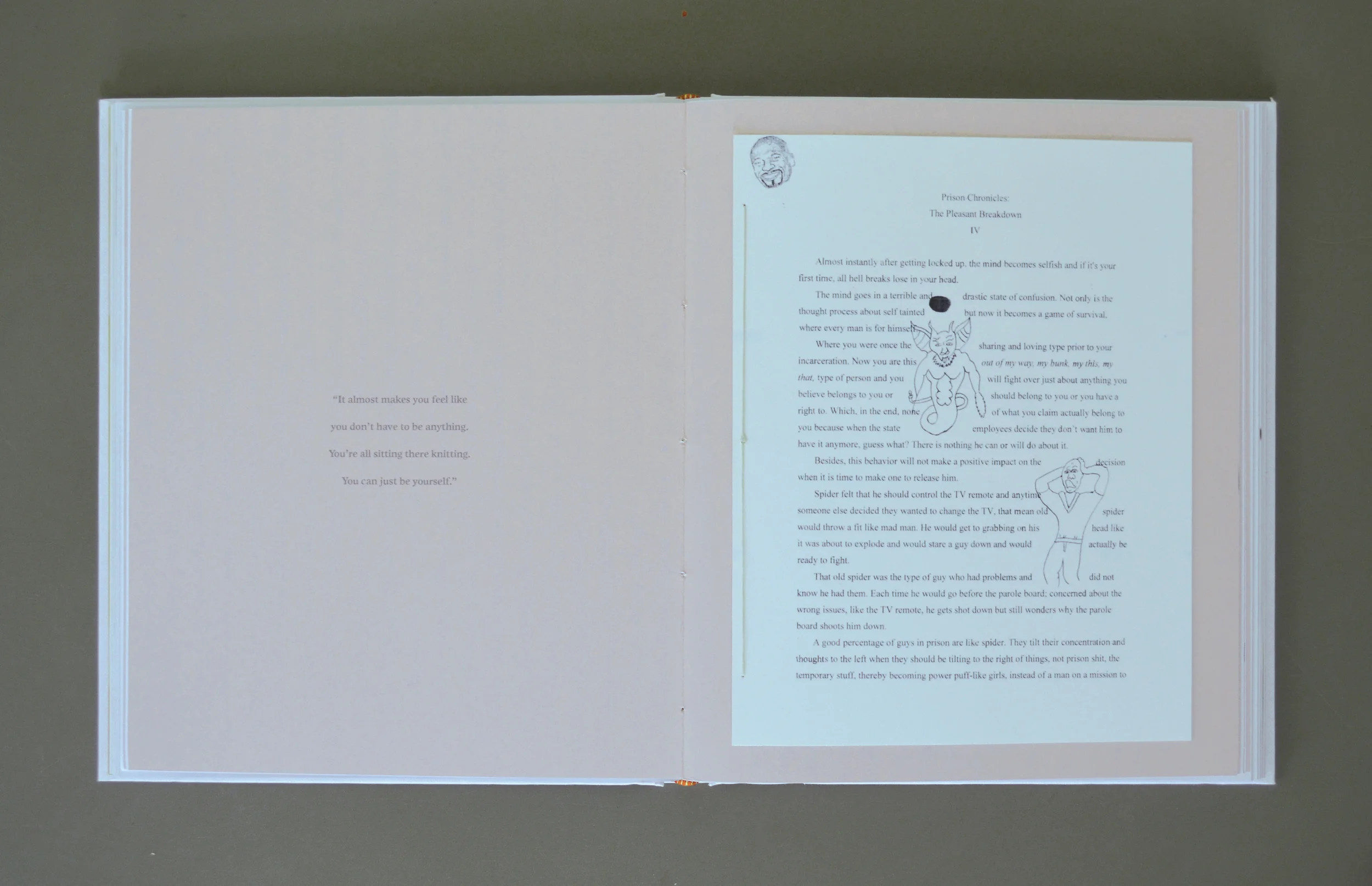 Knitting Behind Bars is a knitting program for male prisoners, founded in 2009 by Lynn Zwerling of Columbia, Maryland. The program’s main aim is to help the inmates grow important social and personal skills before re-entering the outside world. My intent with this project was to humanize the inmates involved in Knitting Behind Bars, highlighting the freedom from judgments, monotony, and violence that knitting provides. It is an homage to the participating inmates and the small steps they took to rebuild themselves, and the women who helped them along the way.